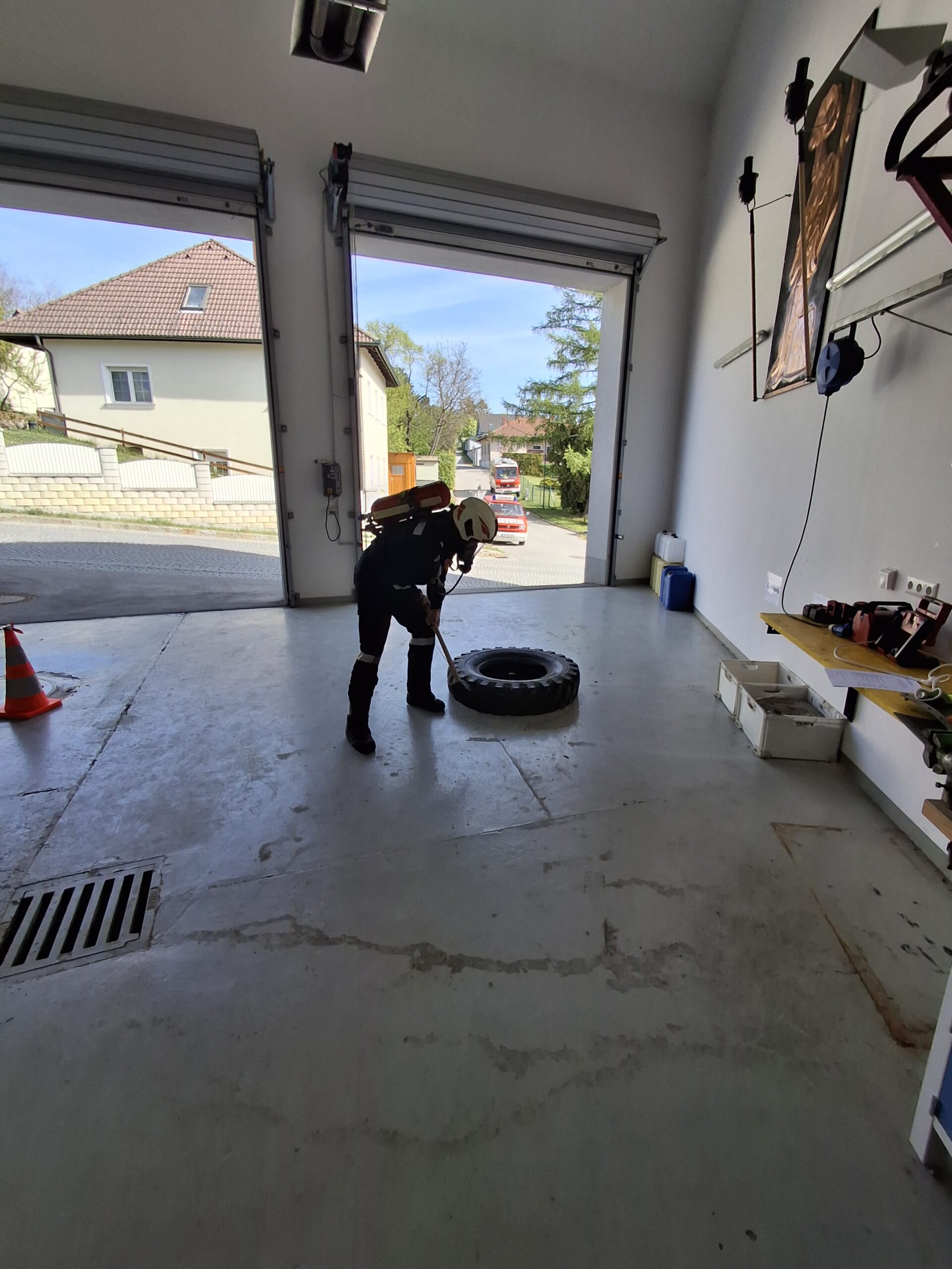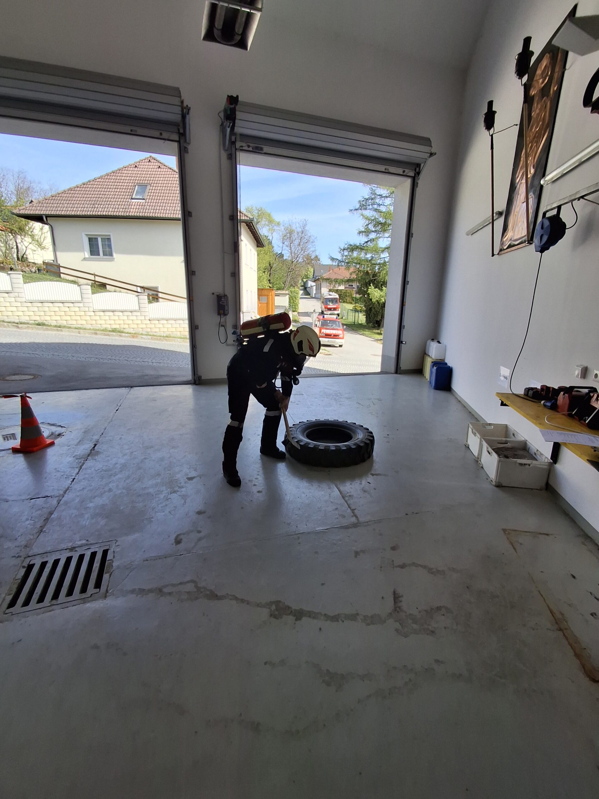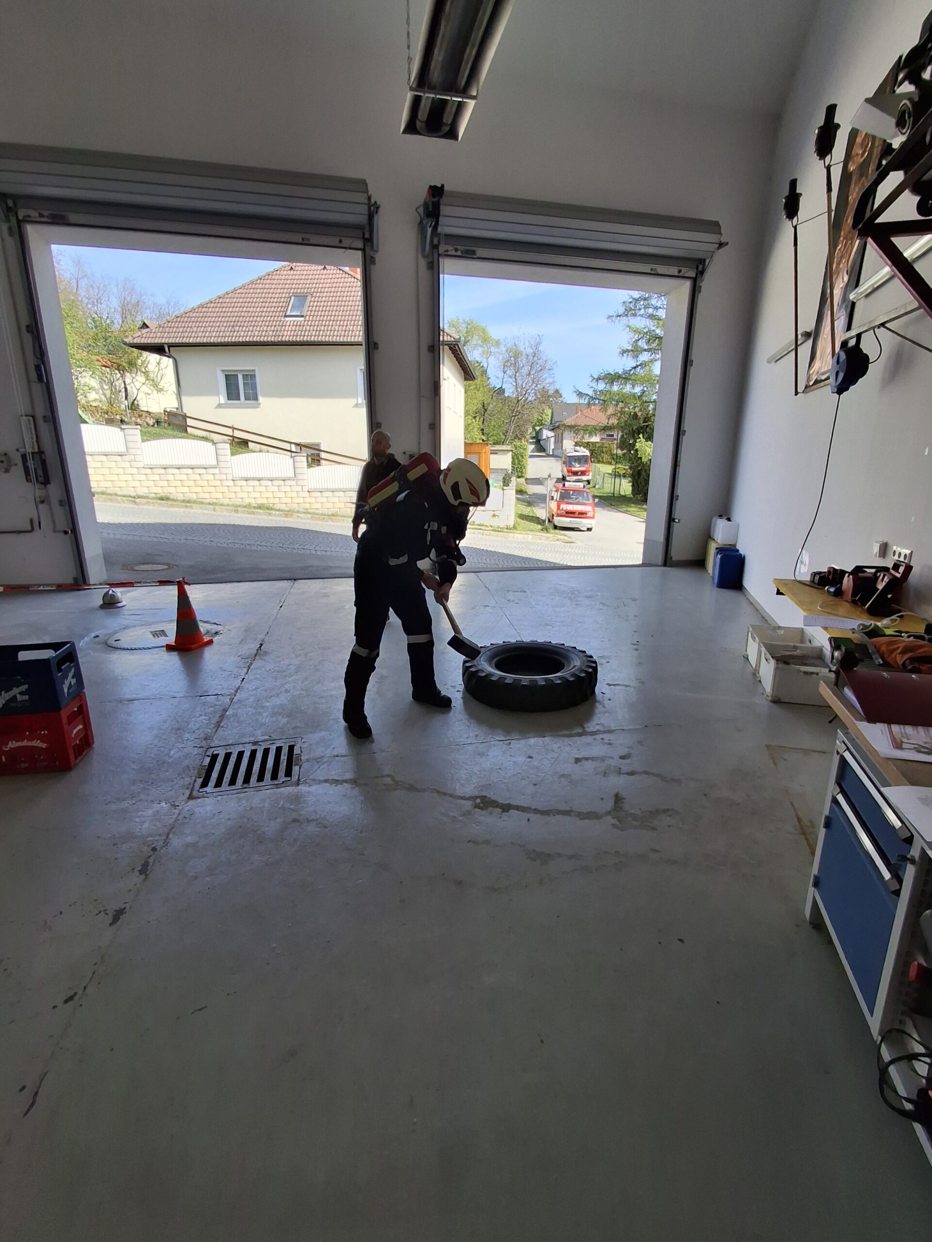Station 3: Hämmern eines 47 kg schweren LKW-Reifens über eine Strecke von 3 Metern mit einem 6 kg Hammer